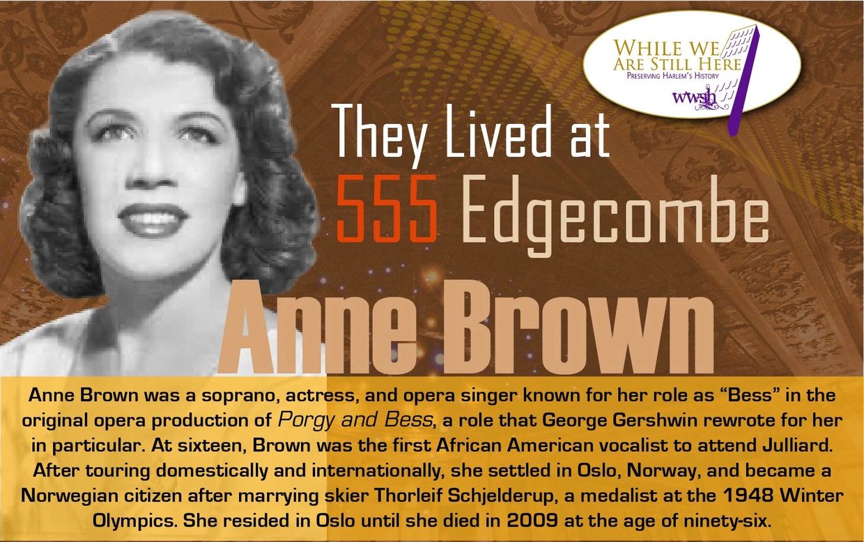 Anne Brown was a soprano, actress, and opera singer known for her role as “Bess” in the original opera production of Porgy and Bess, a role that George Gershwin rewrote for her in particular. At sixteen, Brown was the first African American vocalist to attend Julliard. After touring domestically and internationally, she settled in Oslo, Norway, and became a Norwegian citizen after marrying skier Thorleif Schjelderup, a medalist at the 1948 Winter Olympics. She resided in Oslo until she died in 2009 at the age of ninety-six.