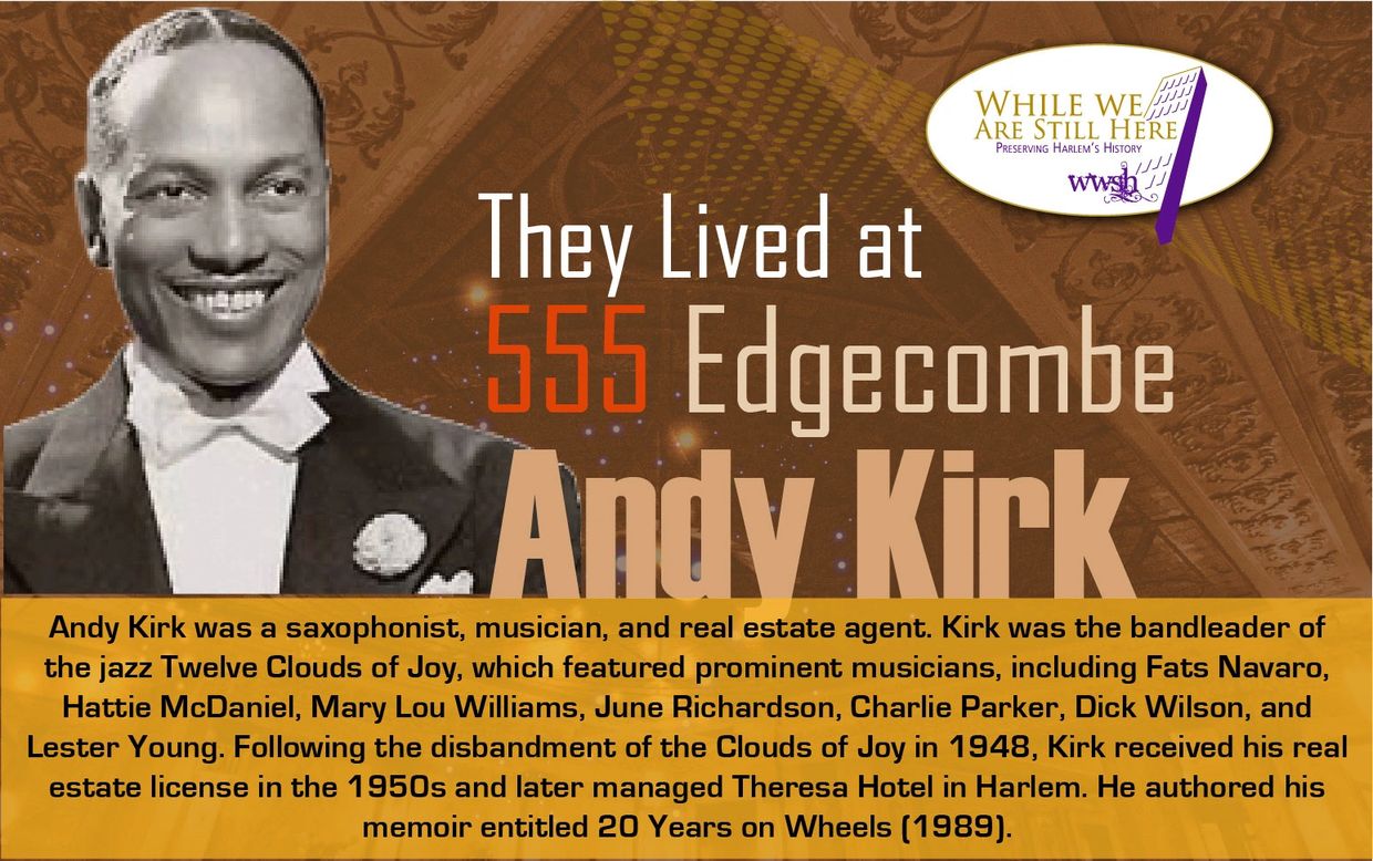 Andy Kirk was a saxophonist, musician, and real estate agent. Kirk was the bandleader of the jazz Twelve Clouds of Joy, which featured prominent musicians, including Fats Navaro, Hattie McDaniel, Mary Lou Williams, June Richardson, Charlie Parker, Dick Wilson, and Lester Young. Following the disbandment of the Clouds of Joy in 1948, Kirk received his real estate license in the 1950s and later managed Theresa Hotel in Harlem. He authored his memoir entitled 20 Years on Wheels (1989).