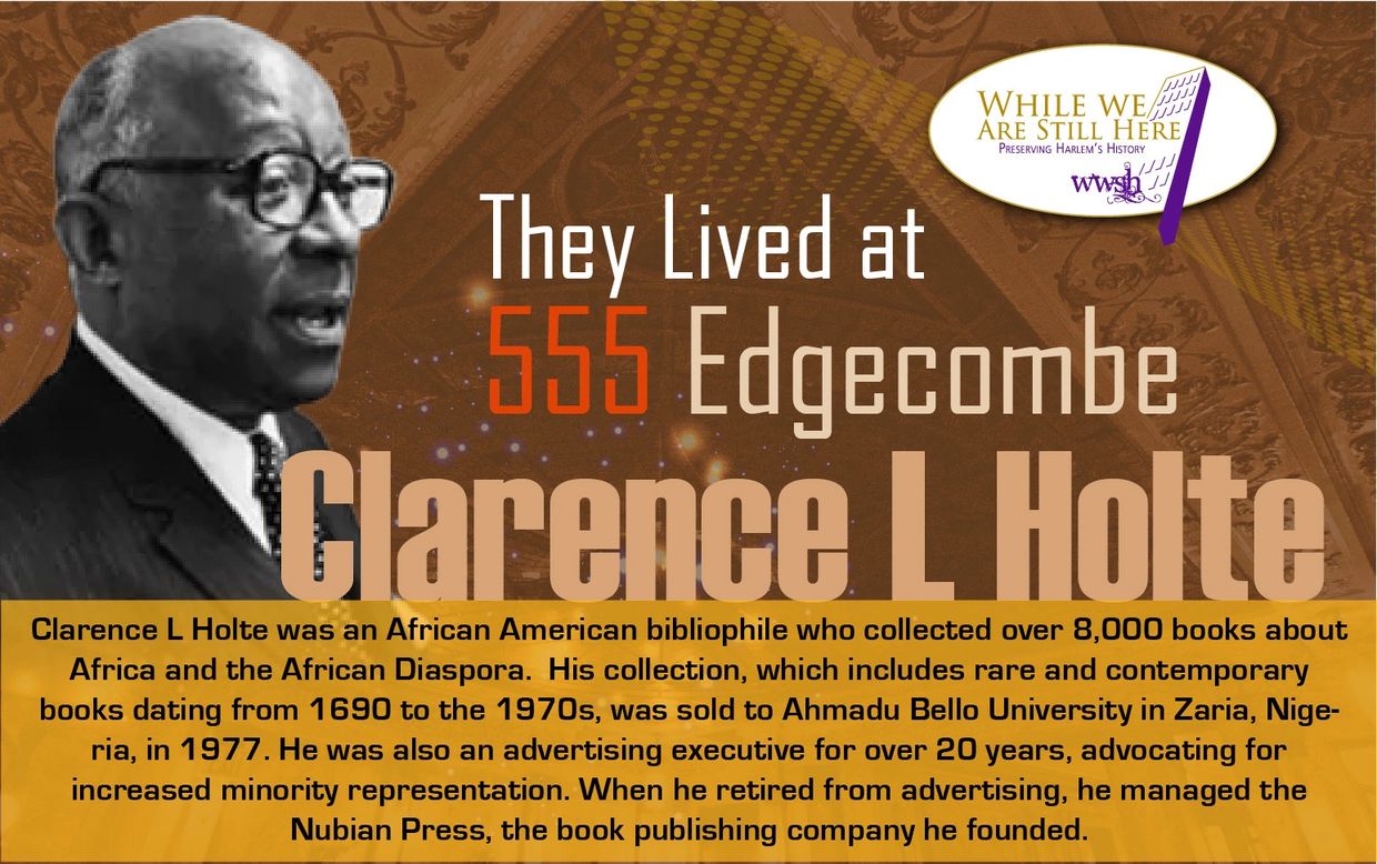 Clarence L Holte was an African American bibliophile who collected over 8,000 books about Africa and the African Diaspora. His collection, which includes rare and contemporary books dating from 1690 to the 1970s, was sold to Ahmadu Bello University in Zaria, Nigeria, in 1977. He was also an advertising executive for over 20 years, advocating for increased minority representation. When he retired from advertising, he managed the Nubian Press, the book publishing company he founded.