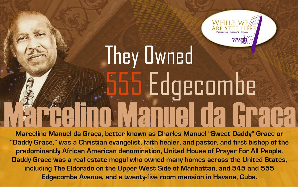 Marcelino Manuel da Graça, better known as Charles Manuel “Sweet Daddy” Grace or Daddy Grace, was a Christian evangelist, faith healer, pastor, and the founder and first bishop of the predominantly African-American denomination of the United House of Prayer For All People. Daddy Grace was a real estate mogul who owned up to forty-two large and expensive mansion homes across the United States, including The Eldorado in the Upper West Side of Manhattan, 545 and 555 Edgecombe Avenue, and a 25-room mansion in Havana, Cuba.