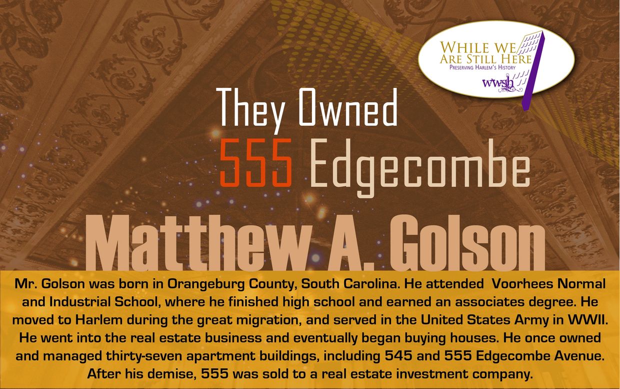 Mr. Golson was born in Orangeburg County, South Carolina. He attended Voorhees Normal and Industrial School, where he finished high school and earned an associates degree. He moved to Harlem during the great migration, and served in the United States Army in WWII. He went into the real estate business and eventually began buying houses. He once owned and managed thirty-seven apartment buildings, including 545 and 555 Edgecombe Avenue. After his demise, 555 was sold to a real estate investment company.