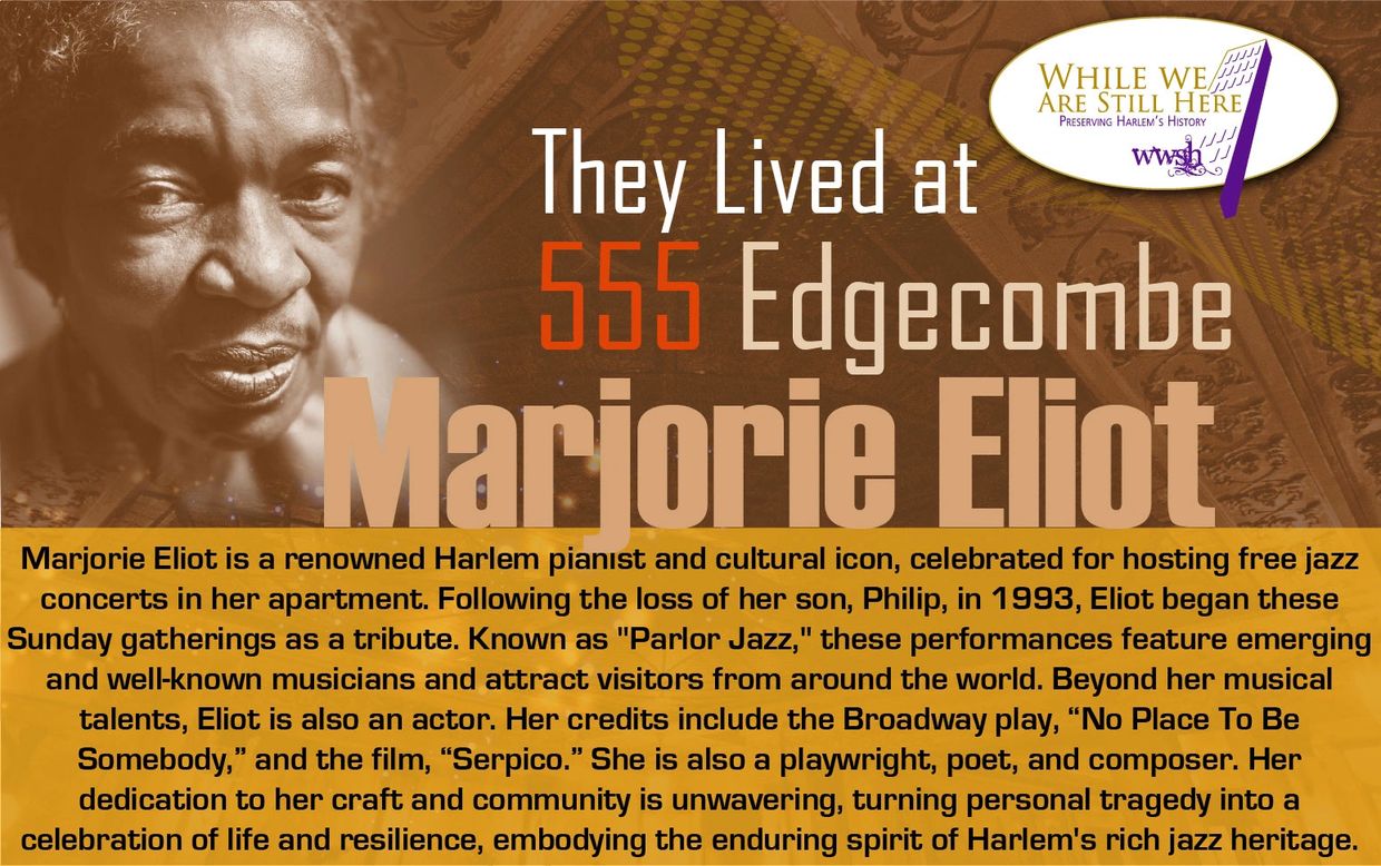 Marjorie Eliot is a renowned Harlem pianist and cultural icon, celebrated for hosting free jazz concerts in her apartment. Following the loss of her son, Philip, in 1993, Eliot began these Sunday gatherings as a tribute. Known as "Parlor Jazz," these performances feature emerging and well-known musicians and attract visitors from around the world. Beyond her musical talents, Eliot is also an actor. Her credits include the Broadway play, “No Place To Be Somebody,” and the film, “Serpico.” She is also a playwright, poet, and composer. Her dedication to her craft and community is unwavering, turning personal tragedy into a celebration of life and resilience, embodying the enduring spirit of Harlem's rich jazz heritage.