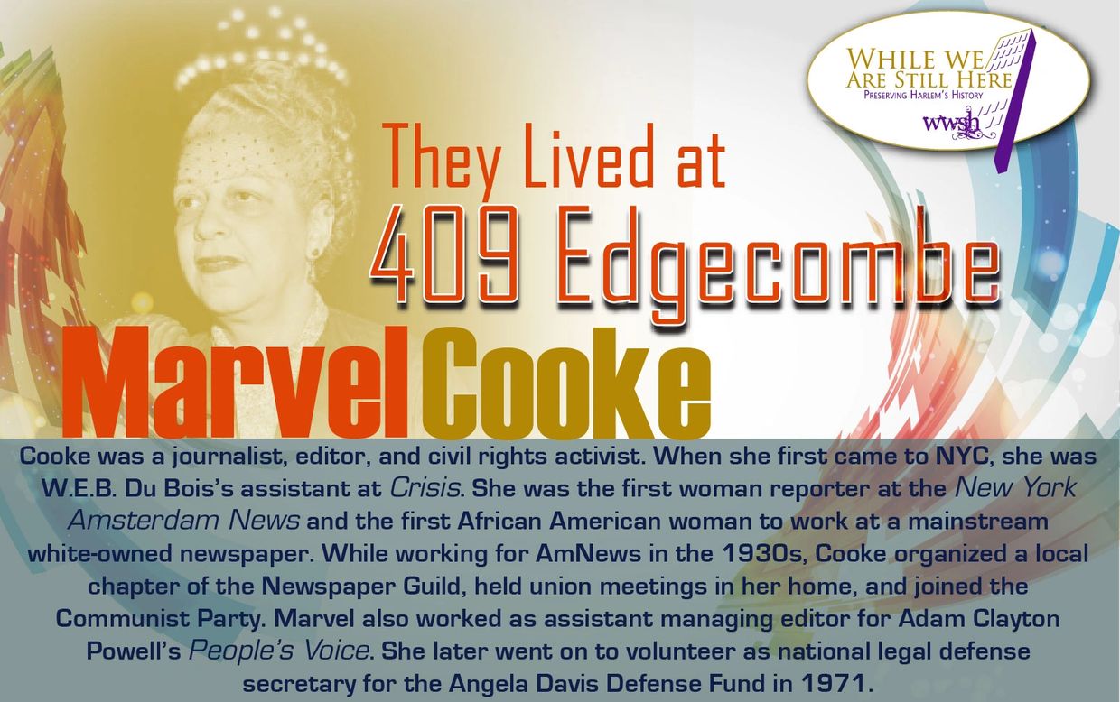 Marvel Cooke (1903-2000) was an American journalist, writer, and civil rights activist. In 1928, she was the first woman reporter at the New York Amsterdam News and the first African-American woman to work at a mainstream white-owned newspaper. While working for Amsterdam News in the 1930s, Cooke helped create a local chapter of the Newspaper Guild, held union meetings in her home, and joined the Communist Party. She later went on to volunteer as national legal defense secretary for the Angela D