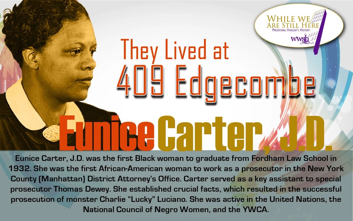 Eunice Carter, J.D. was the first Black woman to graduate from Fordham Law School in 1932. She was the first African-American woman to work as a prosecutor in the New York County (Manhattan) District Attorney’s Office. Carter served as a key assistant to special prosecutor Thomas Dewey. She established crucial facts, which resulted in the successful prosecution of monster Charlie “Lucky” Luciano. She was active in the United Nations, the National Council of Negro Women, and the YWCA.