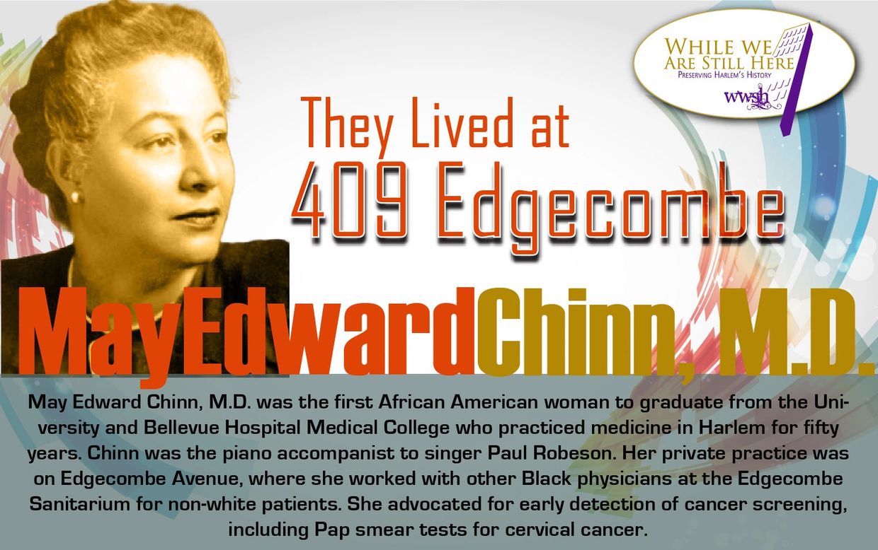 May Edward Chinn, M.D. was the first African American woman to graduate from the University and Bellevue Hospital Medical College who practiced medicine in Harlem for fifty years. Chinn was the piano accompanist to singer Paul Robeson. Her private practice was on Edgecombe Avenue, where she worked with other Black physicians at the Edgecombe Sanitarium for non-white patients. She advocated for early detection of cancer screening, including Pap smear tests for cervical cancer.