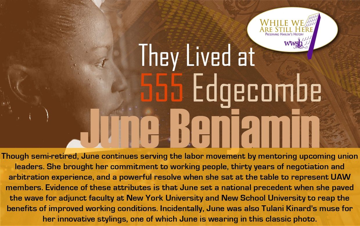 Since the 1970s, June has called 555 Edgecombe Avenue home. She is a veteran organizer for UAW Local 2110 and has devoted many decades to ensuring equality for workers.