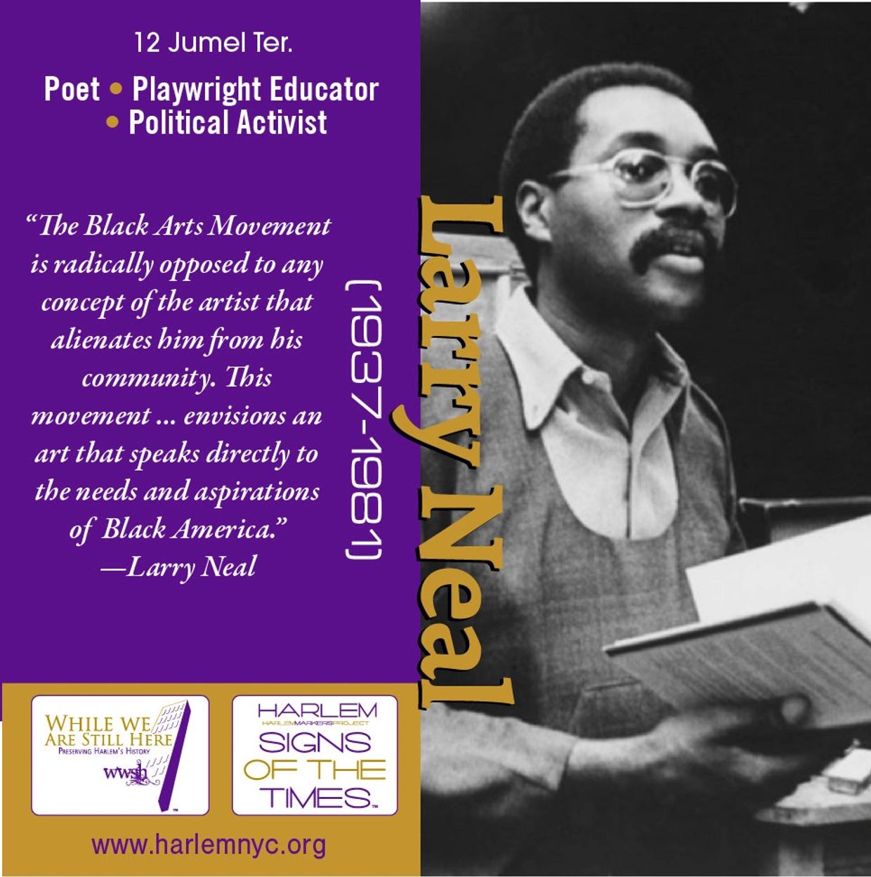 Throughout history and in many different cultures, art has been at the forefront of revolutionary thought and influence. Although enslaved Africans were ripped from their own cultures, the traditions of art being of the people and for the people remained strong. As colonization and oppression destroyed centuries-old concepts of cultural belonging, language, religion, artforms, and heritage, the purpose of art as a means of liberation endured. Enslaved people created stunning hairstyles, whose braid designs were also maps of escape routes. They shared plans for gaining freedom by hiding them within song lyrics. Both these beautiful art forms and others propelled generations to fight back. Larry Neal translated those ancient values of using art to communicate, rebel, and heal into contemporary understanding and practice. He proclaimed that ''Most writers are not thinking about making it on Broadway. The young black writers are re-evaluating Western esthetics and the traditional role of the writer and the social function of art.”