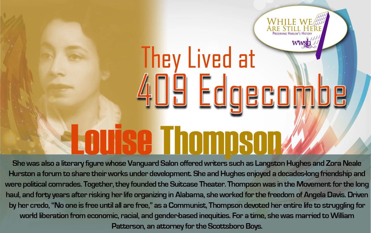 Born in September 9, 1901, Louise Thompson Patterson was an African-American feminist and prominent CPUSA member. She is noted as an early formulator of feminist intersectionality theory, as a leader in the movement to free the Scottsboro Boys in the 1930s, and as a writer and social figure in the Harlem Renaissance of the 1920s and '30s. In 1960s and 1970s, Louise mentored young black activists such as The New York Black Panther leadership, and the CPUSA's Black Liberation Committee, who met re